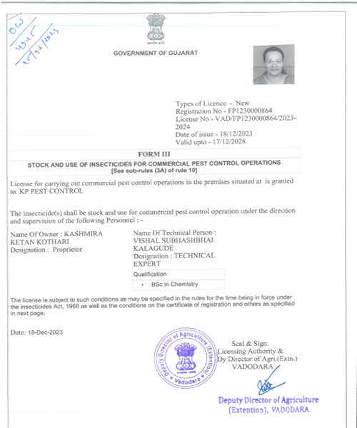 KP Pest Control an experience and certified pest expert. We provide services to hotels, household, offices, Factory and all kind of premises. We use powerful and environment friendly insecticide for pest to eradicate completely from your premises. We follow all the safety regulations and having all the required license for pest control. We have team of trained technicians who have undergone various training from government institute and pest manufacture companies.